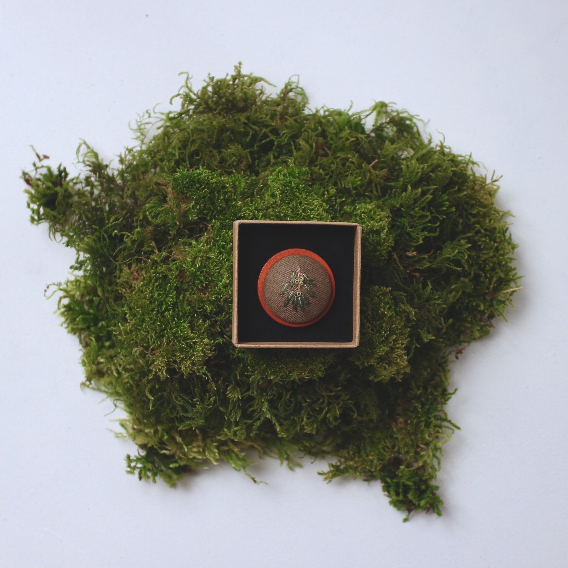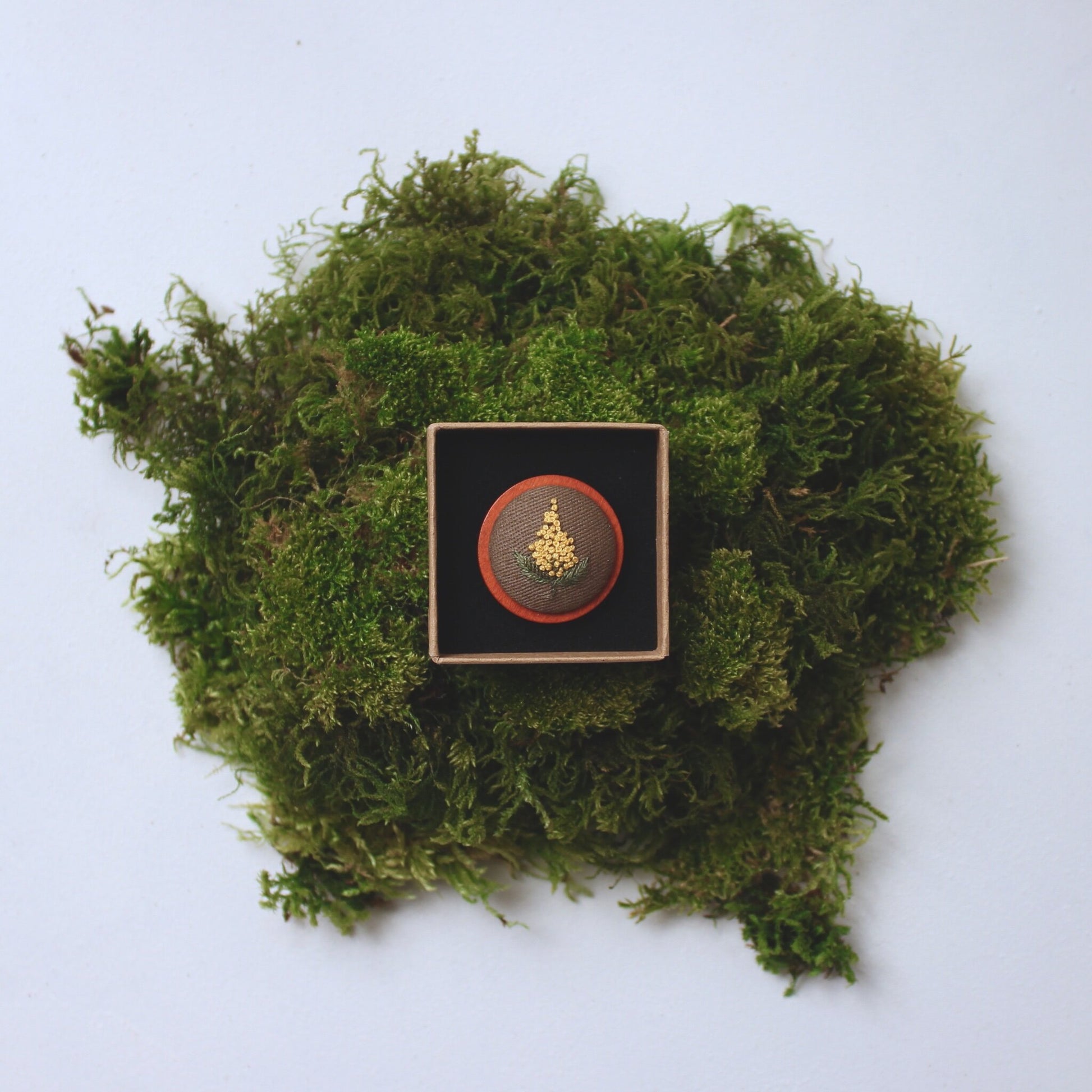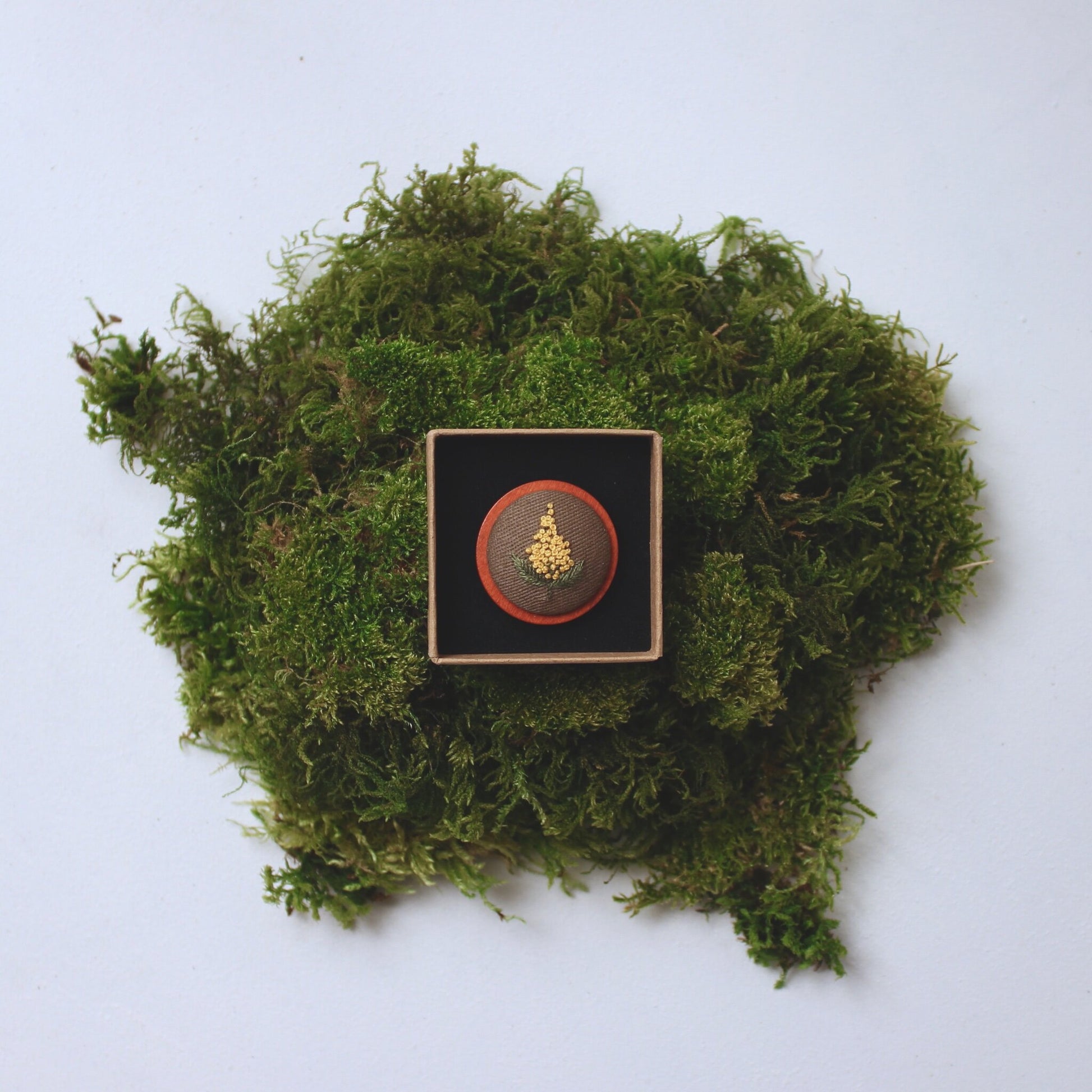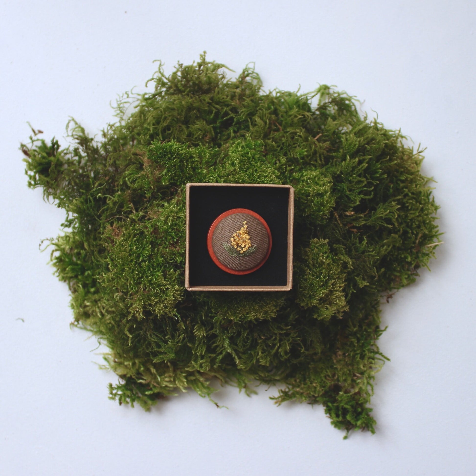 Hand embroidered using DMC thread and seed beads on cotton fabric they are set in a stained wooden tray with a gold butterfly pin and Lemon Pepper Studio signature.