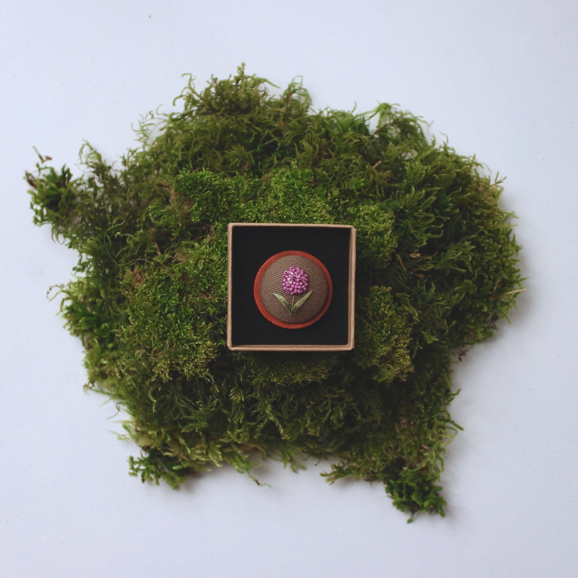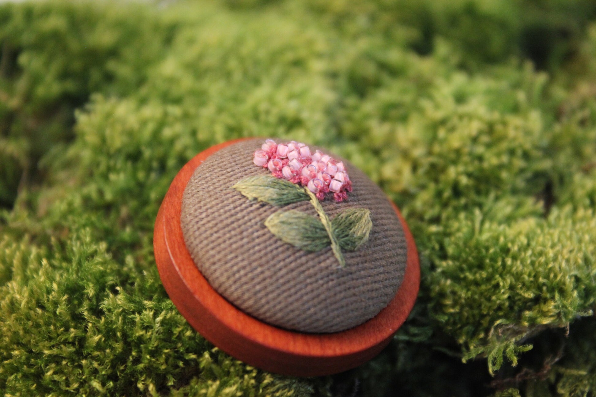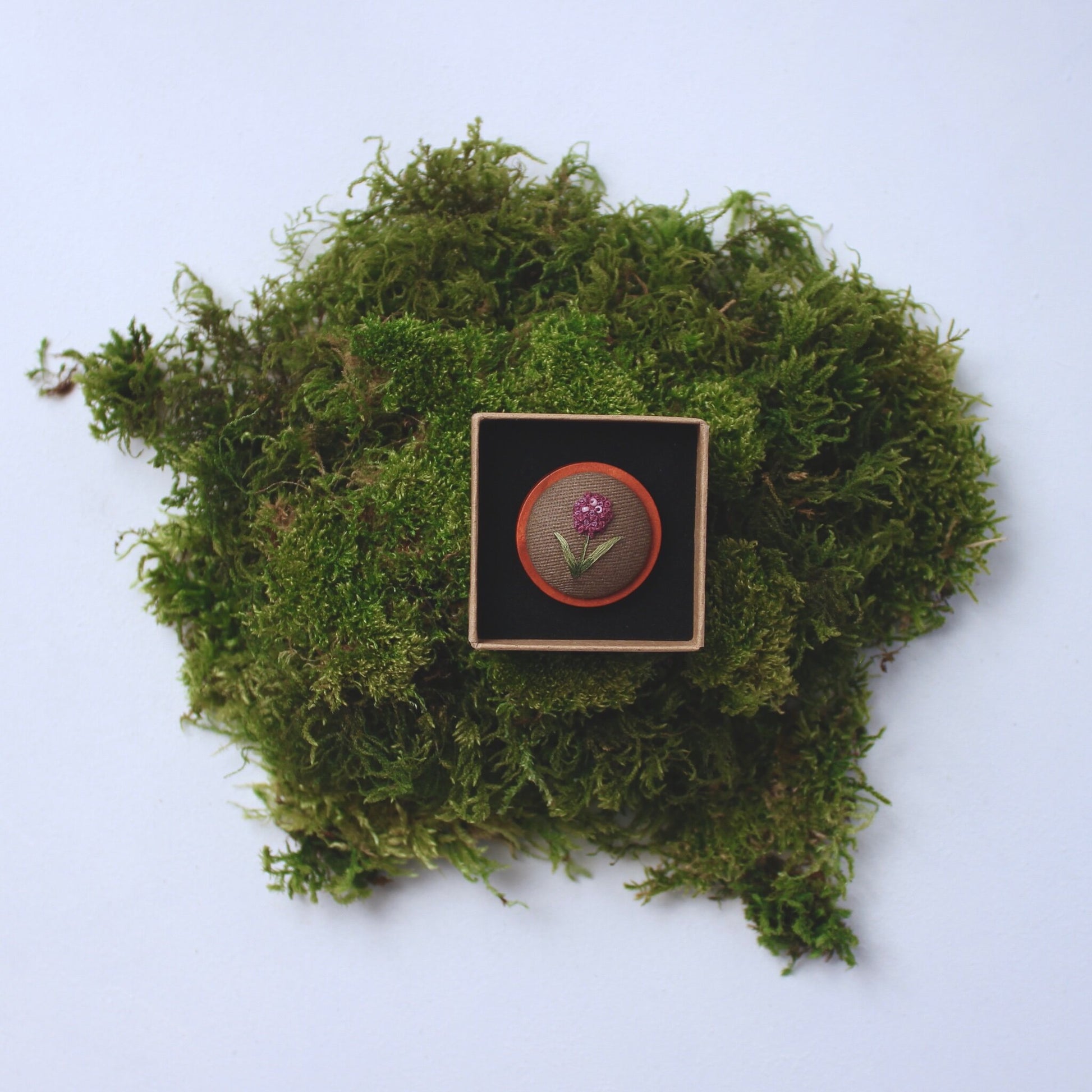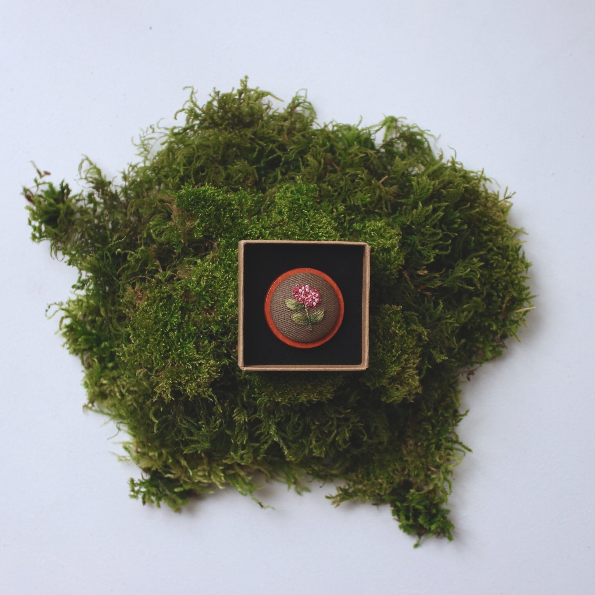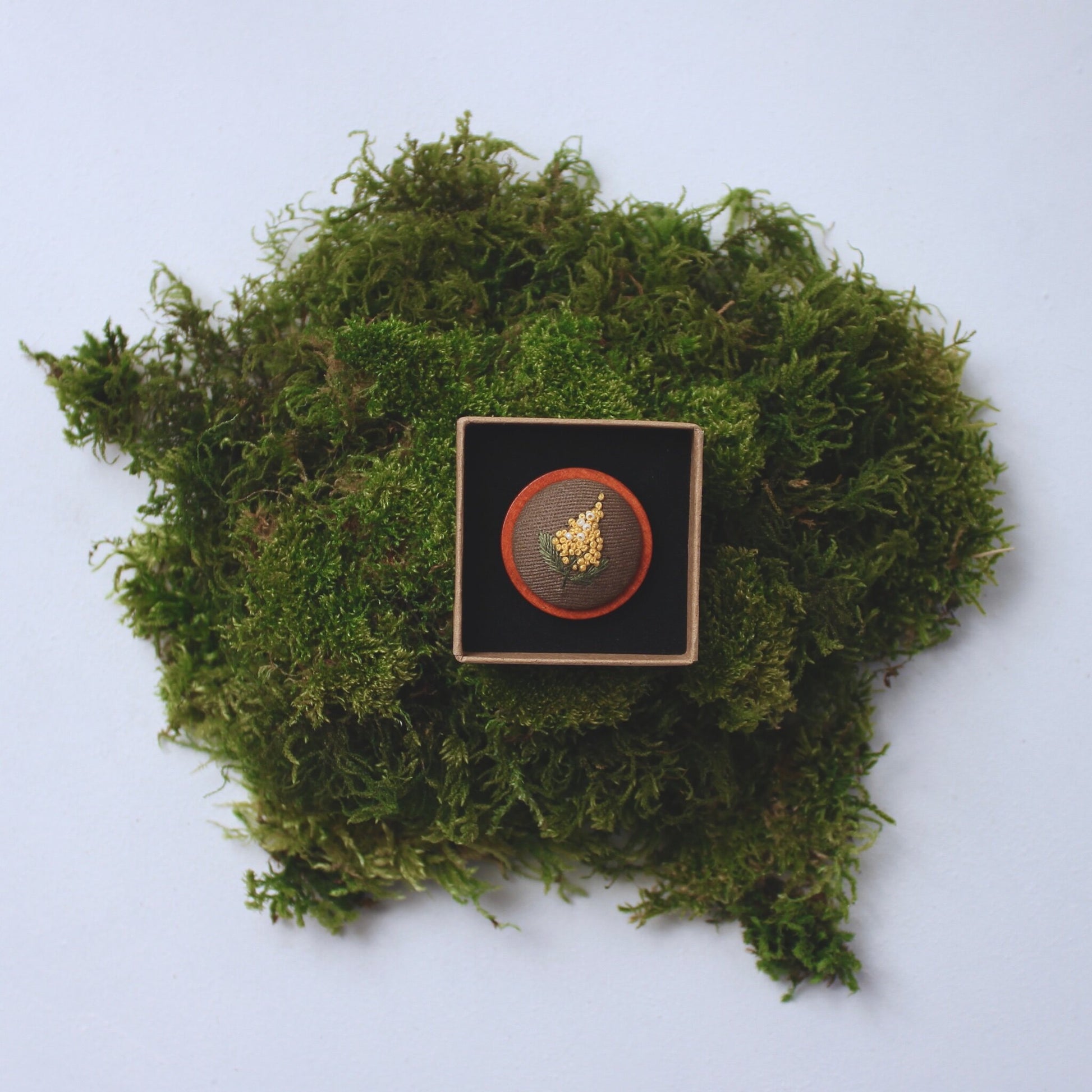 Hand embroidered using DMC thread and seed beads on cotton fabric they are set in a stained wooden tray with a gold butterfly pin and Lemon Pepper Studio signature.