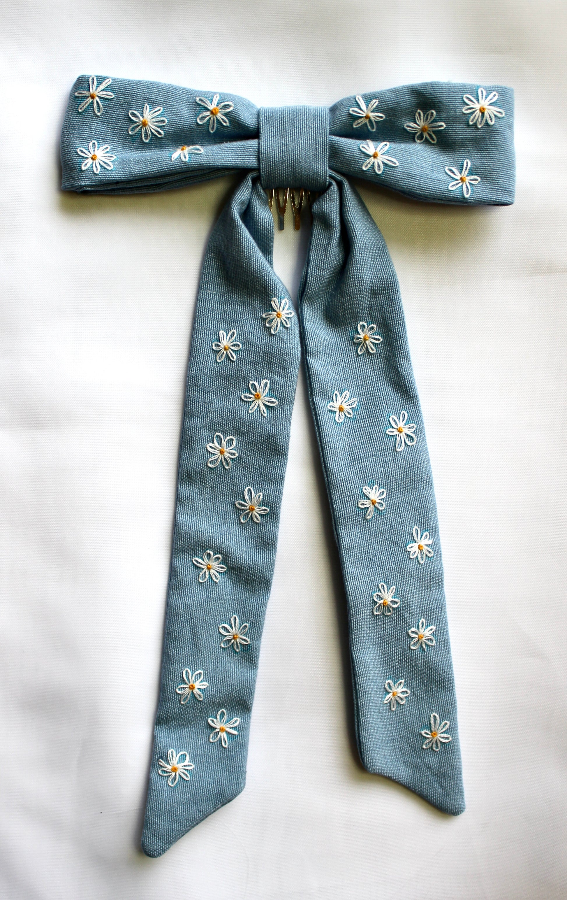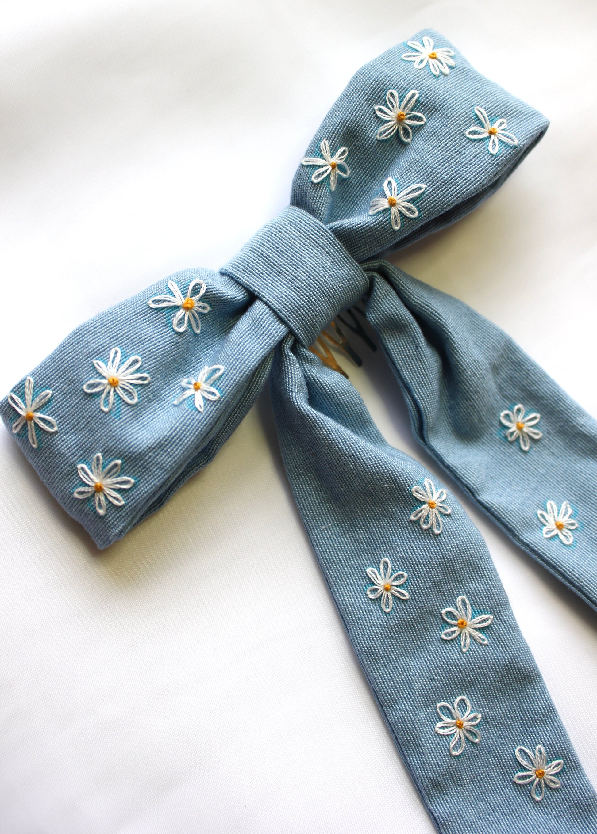 The Daisy Bow is made from cotton and decorated entirely with hand stitched daisies.